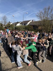 Frau Vajler-Schulze von der Diakonie an Sieg und Rhein war bei uns zu Gast und bei bestem Wetter trafen sich alle auf dem Pausenhof. Passend zum Motto brachte sie  zuerst einen Mitmachtanz für alle Kinder mit und anschließend gab es eine lange Polonaise über den Schulhof. Die Stimmung war ausgelassen und fröhlich.